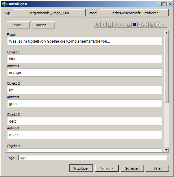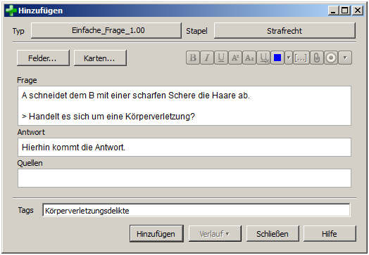 Wenn man auch angeben möchte, wer eine bestimmte Meinung vertritt, kann man dies folgendermaßen tun: In den Feldern Ansicht 1-5 setzt man diese Angabe in eckige Klammern, z.B. [hM], [Rspr] oder [Reichsgericht]. Diese Angaben werden dann nur auf der Antwortseite angezeigt, um zu verhindern, dass man automatisch für die herrschende Meinung argumentiert.