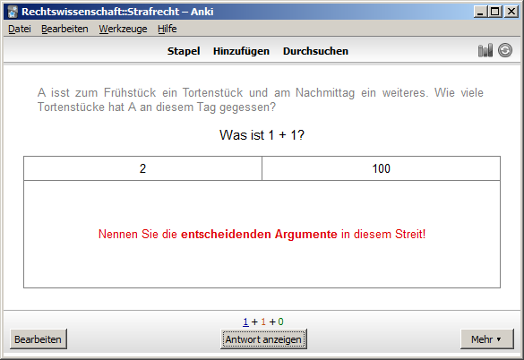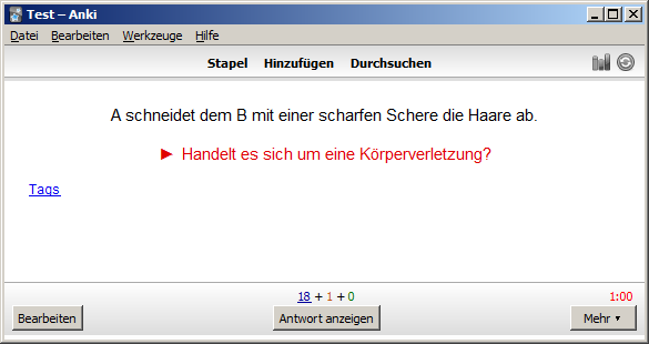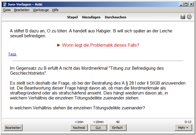 Häufig ist es so, dass eine (abstrakte) Streitfrage sich nicht direkt im (konkreten) Sachverhalt wiederfindet. In einer Klausur wird beispielsweise niemals direkt abgefragt, in welchem Verhältnis die verschiedenen Tötungsdelikte (§§ 211, 212 und 216 StGB) zueinander stehen. Diese Frage muss man erst aus dem Sachverhalt herausarbeiten. Dazu ist das Feld „Erläuterung des Falls“ da. Wenn man dieses Feld ausfüllt, generiert Anki eine Karte, die auf Frageseite den Fall präsentiert und dazu auffordert, zu erläutern, worin die Problematik besteht. Als Antwort wird verlangt, was man in die Felder Erläuterung des Falls und Streitfrage geschrieben hat. Ein Beispiel: