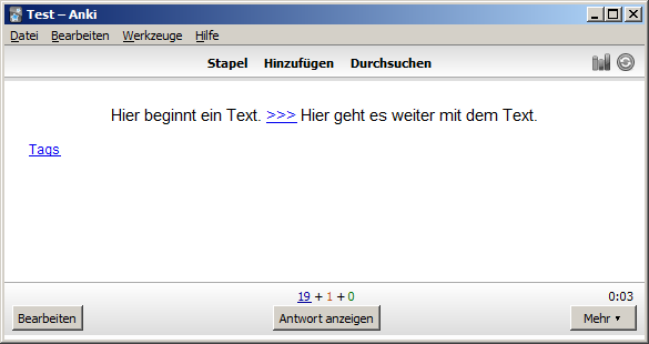 Was abgefragt wird, bestimmst du, indem du den jeweiligen Text markierst und auf das [...]-Symbol oben in der Werkzeugleiste klickst (oder Strg+Umschalt+C drückst). Anki generiert dann eine Karte, auf der alles bis auf diese Stelle angezeigt wird. Von dir wird erwartet, dass du die jeweils ausgeblendeten Informationen nennst.