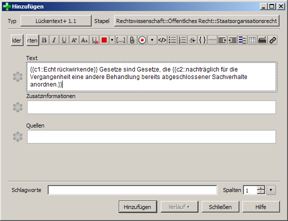Wenn Text abgefragt wird, der zwischen <c> und </c> steht, wird der Text, der auf die jeweils abgefragte Stelle folgt, vorerst ausgeblendet. Das kann z.B. bei längeren Definitionen sinnvoll sein. Bsp: Definition von Tatbestandsmerkmal X: <c>X ist erfüllt, wenn A, B und C gegeben sind.