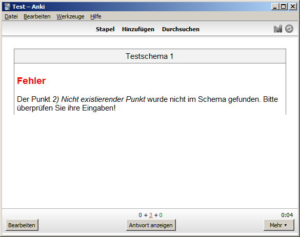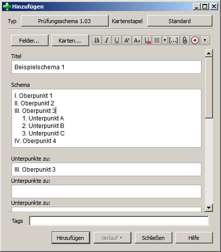 Eine Vorlage, die dabei hilft, Prüfungsschemata in verdaulichen Portionen abzufragen. Da es Menschen grundsätzlich schwer fällt, Listen auswendig zu lernen, sollte man dies nach Möglichkeit vermeiden. Ganz ist das in unserem Fach aber nicht möglich. Diese Vorlage erleichtert einem die Arbeit, indem sie die einzelnen Ebenen eines Schemas getrennt abfragt. Wie das funktioniert, zeigt sich am eindrücklichsten an einem Beispiel.