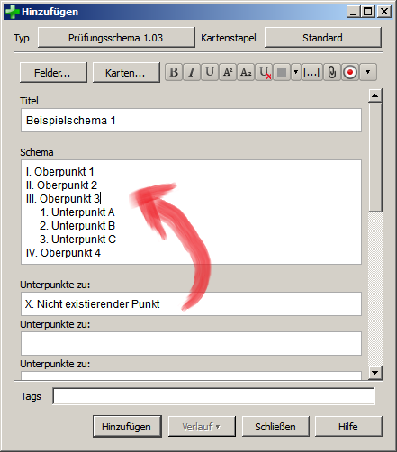 Um den Fehler zu vermeiden, ist es zunächst wichtig, dass das gesamte Schema in das Feld "Schema" eingefügt wird. In die Felder "Unterpunkte zu" werden dann nur noch einmal die einzelnen Punkte eingegeben, deren Unterpunkte selbstständig abgefragt werden sollen. Dabei sollte man die "Unterpunkte zu"-Felder nicht selbst ausfüllen, sondern den Text immer per Copy/Paste aus dem Feld Schema übernehmen. Tritt der Fehler auch auf, wenn man so vorgeht, enthält eines der beiden Felder versteckten HTML-Code. Um diesen zu entfernen, markiert man das jeweilige Feld und klickt auf "Formatierung entfernen" (das U mit dem kleinen roten X in der Mitte der Werkzeugleiste) oder drückt Strg + R. Man kann sich den HTML-Code auch anzeigen lassen und ihn manuell entfernen, indem man die Tasten Strg + Shift + X drückt.