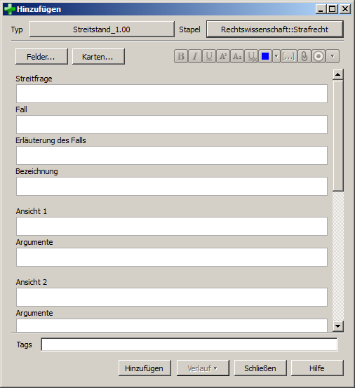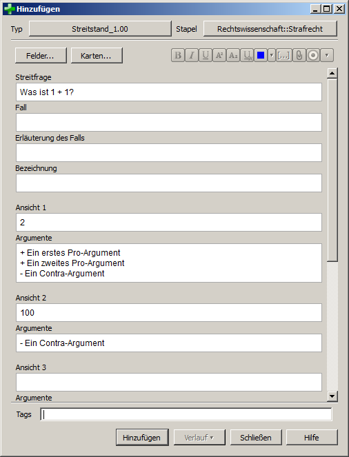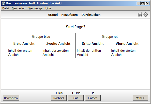 Diese Vorlage dient dazu, Streitstände abzufragen und problematische Fälle zu analysieren. Im einfachsten Anwendungsszenario nutzt man nur die Felder Streitfrage sowie die Felder der einzelnen Ansichten (Ansicht 1, Ansicht 2, Ansicht 3 usw.). Anki wird dann eine Karte generieren, auf deren Vorderseite die Streitfrage angezeigt wird. Die Rückseite enthält die verschiedenen Ansichten, die in dieser Frage vertreten werden.