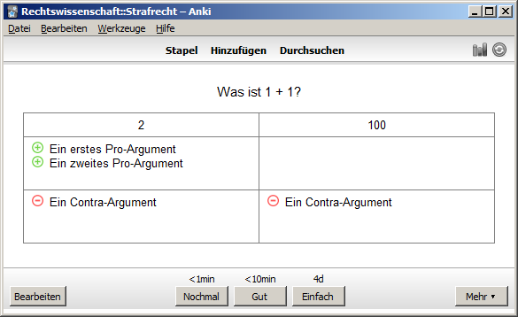 Füllt man eines der Argumente-Felder aus, generiert Anki eine weitere Karte. Die vertretenen Meinungen werden dargestellt und man wird dazu aufgefordert, die dazugehörigen Argumente wiederzugeben.
