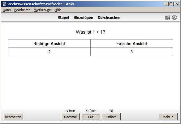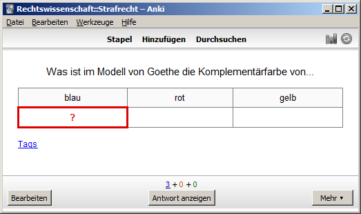 Manche Problemkonstellationen werden unter einer bestimmten Bezeichnung zusammengefasst, beispielsweise Erlaubnistatbestandsirrtum, Aufstiftung oder Präpendenz. Füllt man das Feld Bezeichnung aus, generiert Anki zwei Karten: Zum einen wird abgefragt, welche Problemkonstellation sich hinter dem jeweiligen Begriff verbirgt. Zum anderen wird eine bestimmte Problemkonstellation geschildert und gefragt, wie man diese bezeichnet.