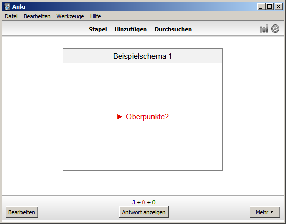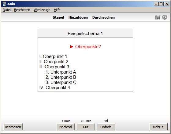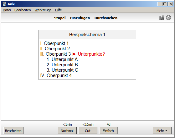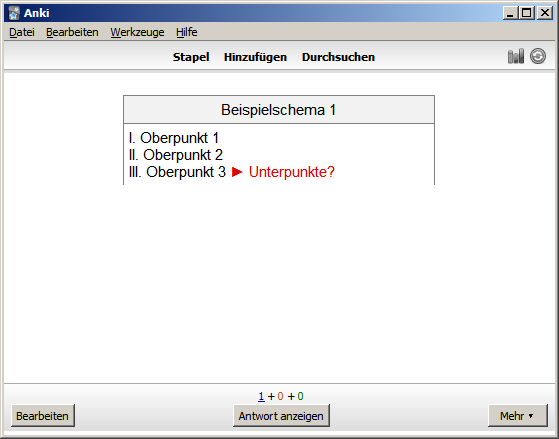 Eine Vorlage, die dabei hilft, Prüfungsschemata in verdaulichen Portionen abzufragen. Da es Menschen grundsätzlich schwer fällt, Listen auswendig zu lernen, sollte man dies nach Möglichkeit vermeiden. Ganz ist das in unserem Fach aber nicht möglich. Diese Vorlage erleichtert einem die Arbeit, indem sie die einzelnen Ebenen eines Schemas getrennt abfragt. Wie das funktioniert, zeigt sich am eindrücklichsten an einem Beispiel.
