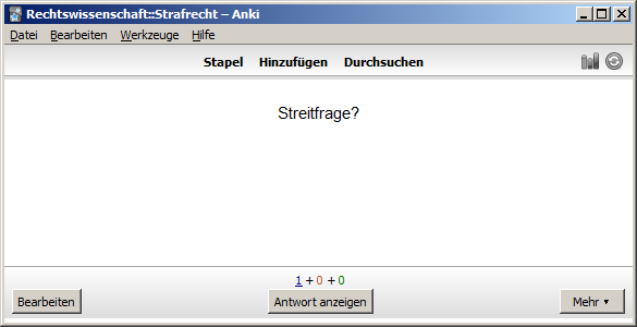 Manche Problemkonstellationen werden unter einer bestimmten Bezeichnung zusammengefasst, beispielsweise Erlaubnistatbestandsirrtum, Aufstiftung oder Präpendenz. Füllt man das Feld Bezeichnung aus, generiert Anki zwei Karten: Zum einen wird abgefragt, welche Problemkonstellation sich hinter dem jeweiligen Begriff verbirgt. Zum anderen wird eine bestimmte Problemkonstellation geschildert und gefragt, wie man diese bezeichnet.