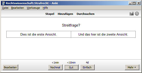 Diese Vorlage dient dazu, Streitstände abzufragen und problematische Fälle zu analysieren. Im einfachsten Anwendungsszenario nutzt man nur die Felder Streitfrage sowie die Felder der einzelnen Ansichten (Ansicht 1, Ansicht 2, Ansicht 3 usw.). Anki wird dann eine Karte generieren, auf deren Vorderseite die Streitfrage angezeigt wird. Die Rückseite enthält die verschiedenen Ansichten, die in dieser Frage vertreten werden.